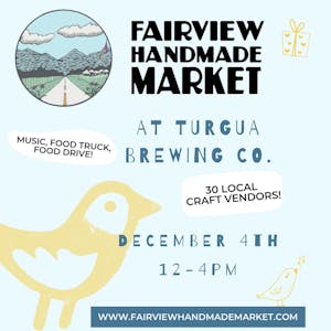 Fairview Handmade Market at Turgua Brewing, Dec 4th, 12:00-4:00PM. 30 Local Vendors. Music, food and Food Drive. Come visit the largest handmade market in Fairview, the perfect place for your Holiday gift shopping.