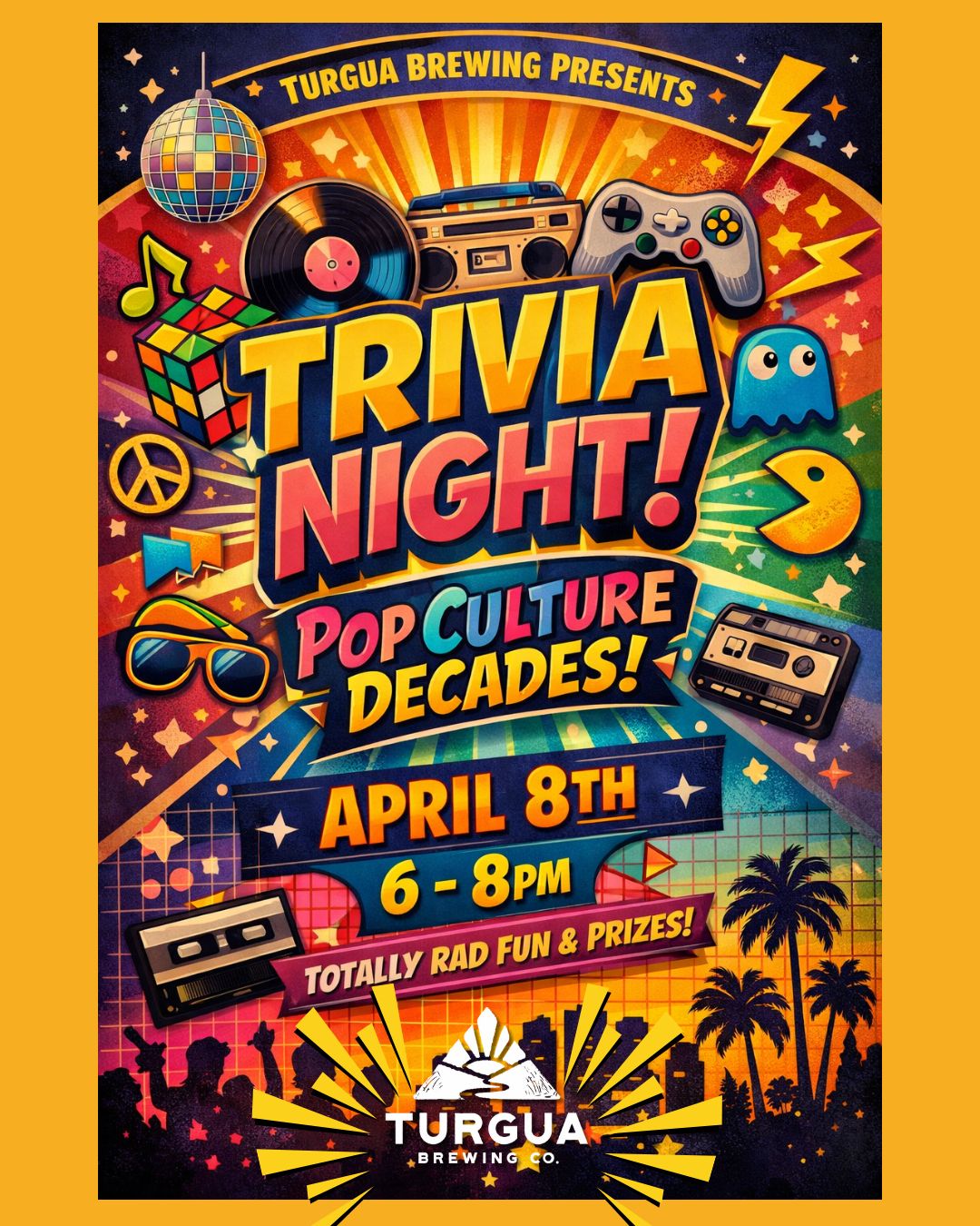 Join us at Turgua Brewing on April 8th for Pop Culture Decades Trivia Night. Bring your smartest friends (or your luckiest ones 😉) and compete for prizes!