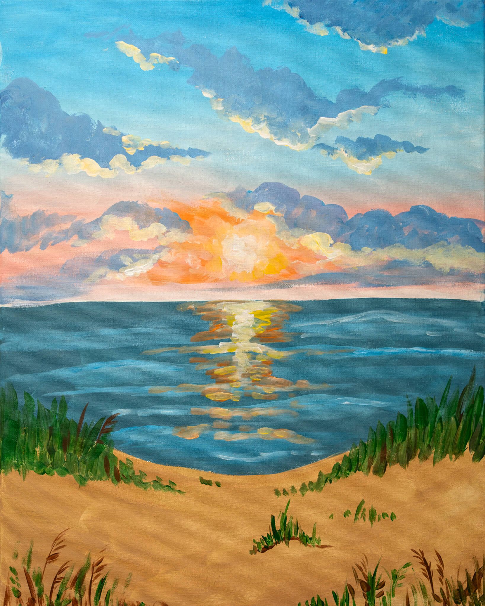Skilled instructors will help guide you through each step so that you can recreate this majestic sunset beach painting. 🌞🌴
