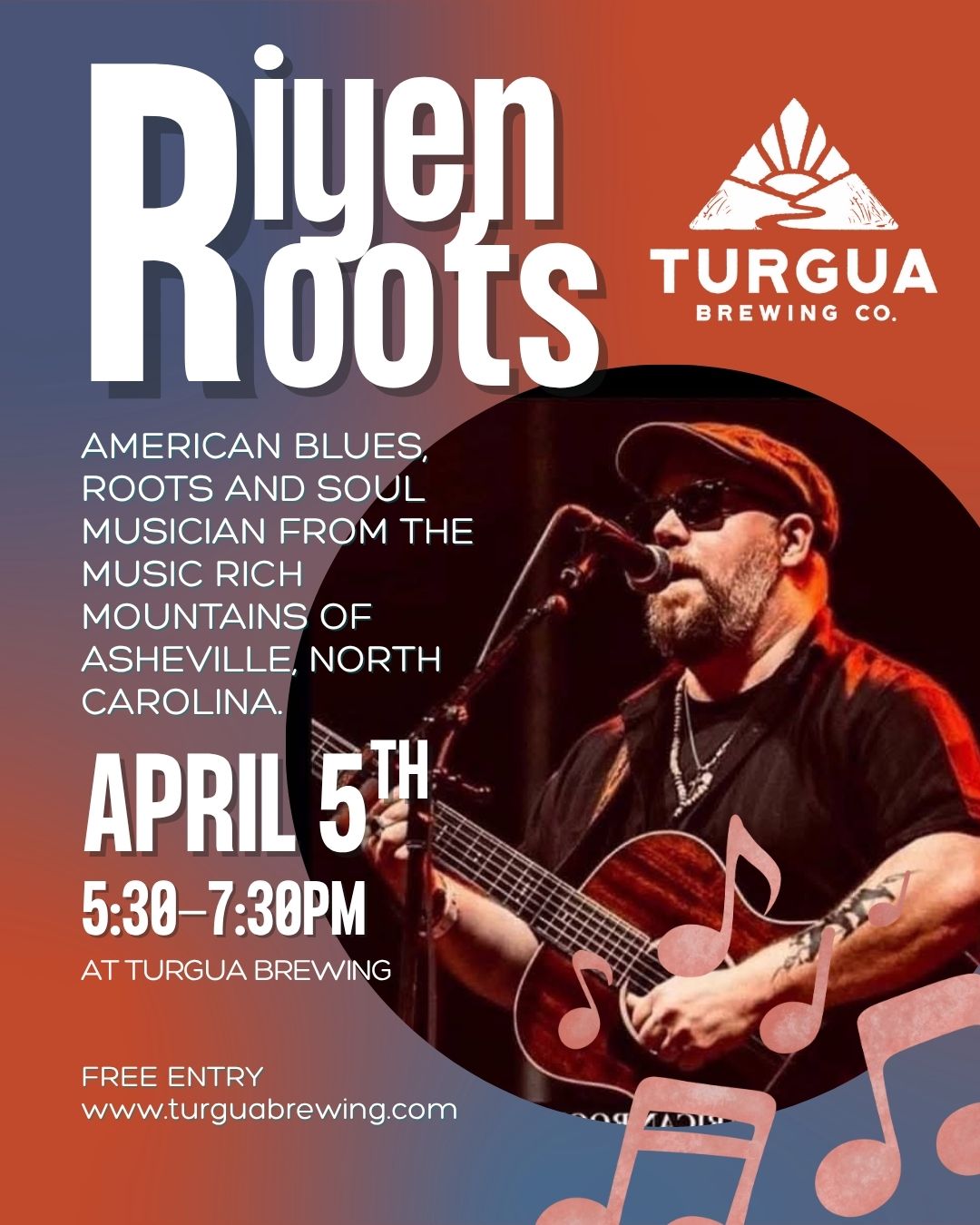 Join us April 5th from 5:30–7:30 PM for an evening with Riyen Roots an American blues, roots and soul musician from the music rich mountains of Asheville, North Carolina. With his unique vocal styling and captivating original songs and covers from some of the best in blues, southern soul and rock history, he is one of the busiest acts in the in the south east.