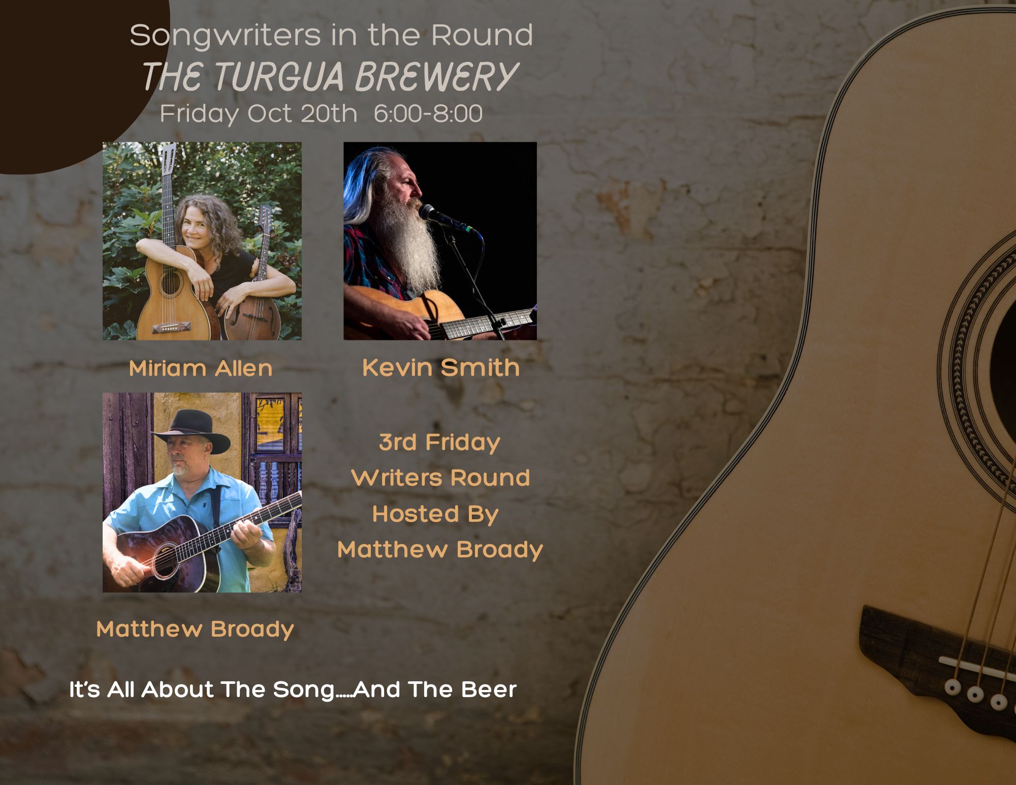 Join us on October 20th at 6pm for Songwriters in the Round with Matthew Broady, Mairam Allen & Kevin Smith