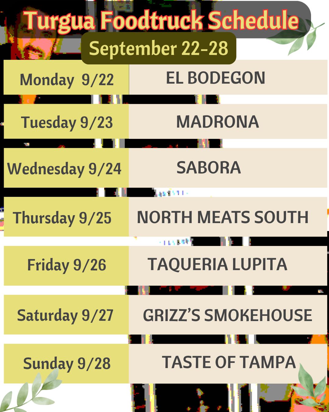 TURGUA FOOD TRUCK SCHEDULE SEP 22-28, 2025