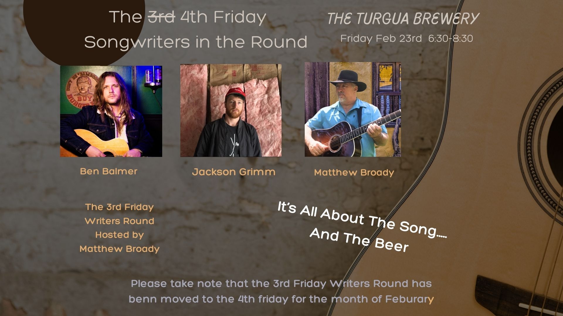 Join us for Songwriters in the Round with Matthew Broady, Ben Balmer & Jackson Grimm